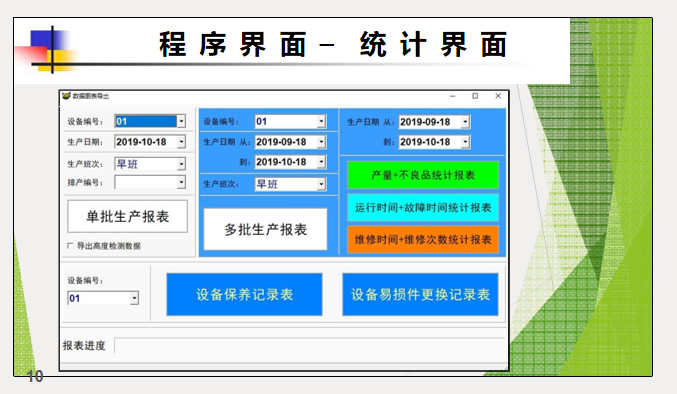 有豐富的統(tǒng)計功能,對于產(chǎn)量、不良品按時間進行統(tǒng)計,統(tǒng)計維修時間、維修次數(shù)、停 機時間、停機次數(shù)、運行時間,這些龐大的基礎數(shù)據(jù)進行歸類,可以為決策者制定生產(chǎn) 和設備改善計劃提供強大的數(shù)據(jù)支持。