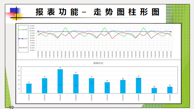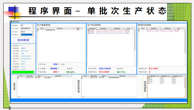 可以記錄每個生產(chǎn)批次的生產(chǎn)數(shù)量、不良數(shù)量、停機時間、運行時間、維修時間、維修 次數(shù),可以記錄設備的保養(yǎng)和易損件更換。